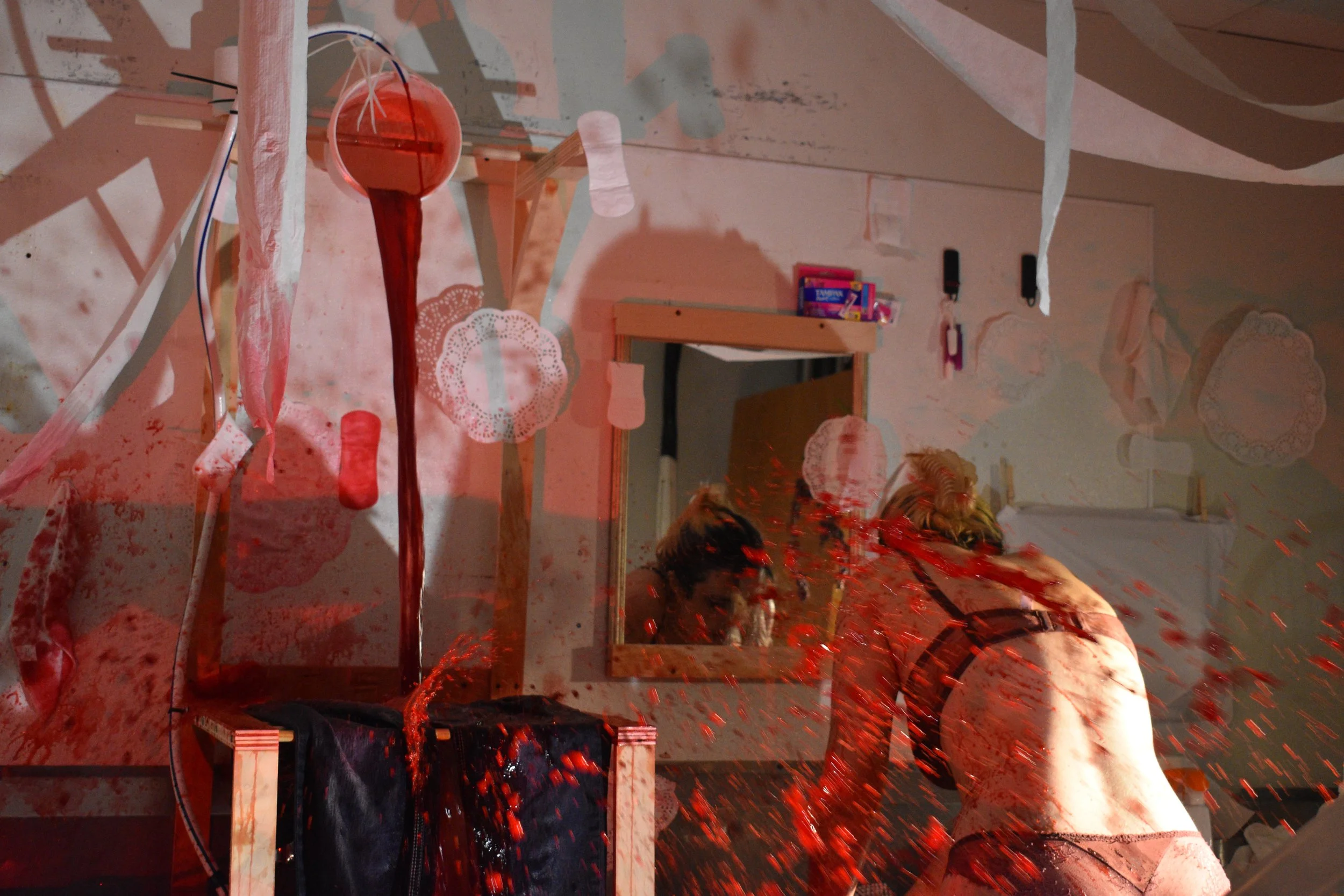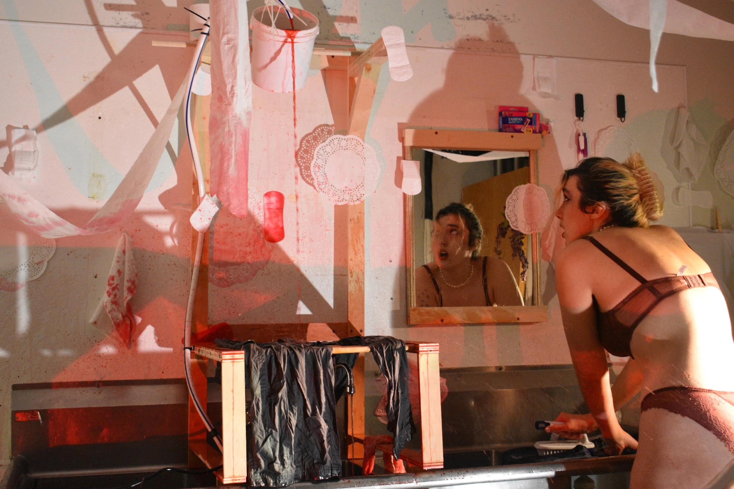 Why is a drying rack placed right below a cartoonish bucket dump? Why do I continue to put clothes on the drying rack when I know the bucket will dump again? Why am I dressed in lingerie with heavy makeup as I clean and rush about? And why is this pointless endeavor 7 hours long??! I heave, I shiver, I sweat, I gasp, I struggle, I slip, I rush, I cry. And the bucket keeps pouring. So, I keep cleaning until my period ends (the 7 hours are up) and I dump the remaining bucket upon myself.